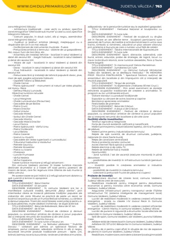 WWW.GHIDULPRIMARIILOR.RO JUDE%u021aUL V%u00c2LCEA / 763zona M%u0103rginimii Sibiului- Arhitectura tradi%u0163ional%u0103 - case vechi cu pridvor, specifice zonei etnografice %u201cOltenia de sub munte%u201d %u015fi case cu ocol, specifice M%u0103rginimii Sibiului- Costum popular, %u00een dou%u0103 culori, alb %u015fi negru, asem%u0103n%u0103tor zonei M%u0103rginimii Sibiului- Cus%u0103turi %u015fi %u0163es%u0103turi artistice (desagi), me%u015fte%u015fuguri cu o r%u0103sp%u00e2ndire din ce %u00een ce mai redus%u0103- Confec%u0163ionare de instrumente muzicale - fluiere- Prelucrarea artistic%u0103 a lemnului - obiecte de uz gospod%u0103resc: l%u0103zi, co%u015furi, furci de tors l%u00e2na, etc.- Ansamblu de instala%u0163ii tehnice - localizat %u00een satul Vaideeni %u015fi datat din secolul XIX%u00a0 - Joag%u0103r hidraulic - localizat %u00een satul Vaideeni %u015fi datat din secolul XIX - Moara de ap%u0103 - localizat%u0103 %u00een satul Vaideeni %u015fi datat%u0103 din secolul XIX- Darac - localizat %u00een satul Vaideeni %u015fi datat din secolul XIX- Piua hidraulic%u0103 - localizat%u0103 %u00een satul Vaideeni %u015fi datat%u0103 din secolul XIX- Prelucrarea l%u00e2nii %u015fi instala%u0163ii de tehnic%u0103 popular%u0103: darac, pive, mori de ap%u0103, joag%u0103re ac%u0163ionate hidraulic- Capelele Talanci %u015fi B%u0103dule%u0219ti- Cheile Cernei -%u201dPiatra sp%u00e2nzurat%u0103%u201d - monument al naturii pe Valea plopilor, sat Izvoru- Rece- Defileul R%u00e2ului Luncav%u0103%u0163Obiective turistice naturale:- Cheile Cernei- Lacul Marginea- Cheile Luncavatului (Paraul Sec)- Cascadele de pe Balota- Piatra Crucii- Moara Dracilor- Col%u021bul Ursului- Cascada Miresii- Sorbul din Cheile Cernei- Cascada Miori%u021ba- Cascada Moara Dracilor- Lacul Florica - Piatra Sp%u00e2nzurat%u0103%u00a0- V%u00e2rful Ursu- Piatra %u00cenc%u0103lecat%u0103- Lacul Balota - Piatra Caseriei- Izvorul cu mu%u0219chi- Cascadele din Valea superioar%u0103%u00a0a Luncav%u0103%u021bului- Tribunalul haiducilor %u0219i Vazduhul- Pietrele Gauriciu- Pietrele Stroestilor- Piatra cu Icoana- Cheisoara- Luncile Frumoase- V%u00e2rful Nedeia- V%u00e2rful CapatanaTrasee turistice montane %u015fi refugii salvamont :Din comuna Vaideeni pornesc 10 trasee turistice marcate destinate drume%u021bilor %u0219i 2 trasee off road pentru posesorii de ma%u0219ini de teren, care fac legatura %u00eentre Oltenia de sub munte %u0219i Valea Lotrului.Pe aceste trasee se pot %u00eent%u00e2lnii %u0219i 2 refugii salvamont dotate cu ap%u0103%u00a0curent%u0103%u00a0%u0219i lemne %u00een apropriereEvenimente:TITLU EVENIMENT : Balul OierilorDATA EVENIMENT : 01 ianuarieDESCRIERE EVENIMENT : %u00cen comuna Vaideeni are loc o manifestare cultural%u0103 inedit%u0103, denumit%u0103 %u201eBalul oierilor%u201d, prin intermediul c%u0103reia se %u00eencearc%u0103 p%u0103strarea tradi%u0163iilor populare ale ciobanilor din zon%u0103. Ritualul se practic%u0103 de peste un secol, iar localnicii se pot bucura de un frumos festival rom%u00e2nesc, cu c%u00e2ntece %u015fi dansuri populare. Tinerii din zon%u0103 folosesc acest prilej %u015fi pentru a%u015fi c%u0103uta perechea, multe c%u0103s%u0103torii %u00eencheindu- se dup%u0103 acest bal.TITLU EVENIMENT : Balul de Boboteaz%u0103%u00a0; Balul de Sf. IonDATA EVENIMENT : de Sf IonDESCRIERE EVENIMENT : Festival de c%u00e2ntece %u0219i dansuri populare, cu ansambluri artistice de c%u00e2ntece %u0219i jocuri populare dar %u0219i interpre%u021bi renumi%u021bi din localitate %u0219i din alte zone.TITLU EVENIMENT : %u00cenv%u00e2rtita DoruluiDATA EVENIMENT : %u00cen luna Iunie a fiecarui an.DESCRIERE EVENIMENT : La festivalul p%u0103storesc %u2018%u2019 %u00cenv%u00e2rtita Dorului %u2018%u2019 vizitatorii pot admira un spectacol folcloric de amploare, portul ciob%u0103nesc, adev%u0103rata simfonie %u00een alb %u0219i negru, savureaz%u0103%u00a0 renumite produse tradi%u021bionale precum : lapte, unt, br%u00e2nz%u0103, balmo%u0219, tocan%u0103, bucur%u00e2ndu- se de aerul s%u0103n%u0103tos al mun%u021bilor, ad%u0103postindu- se la pensiunile turistice sau la ospitalierii gospodari.TITLU EVENIMENT : Festivalul Na%u021bional al Sculptorilor cu DrujbaDATA EVENIMENT : %u00cen luna Iulie.DESCRIERE EVENIMENT : Festival de sculptur%u0103%u00a0 cu drujba are %u00een fiecare an are diferite teme . Sculptorii participan%u021bi sunt pasiona%u021bi de frumos, de tradi%u021bie %u0219i art%u0103%u00a0dorind s%u0103%u00a0lase %u00een urma ceva trainic, simbolic %u0219i rom%u00e2nesc, aduc%u00e2nd un plus valoare viitorului prin prietenia %u0219i bucuria pe care o nutresc unul fa%u021b%u0103%u00a0de celalat.TITLU EVENIMENT : Tab%u0103ra Interna%u021bional%u0103 de Supravie%u021buireDATA EVENIMENT : %u00cen luna IulieDESCRIERE EVENIMENT :Sport, distrac%u021bie, adrenalin%u0103, voie bun%u0103, antren, educa%u021bie, probe de strategie, de logic%u0103, locuri cu mare %u00eenc%u0103rc%u0103tur%u0103%u00a0istoric%u0103, zone turistice deosebite, flora %u0219i fauna foarte bogat%u0103TITLU EVENIMENT : %u00cen memoria prof. Felicia PantelimonDATA EVENIMENT : Jum%u0103tatea luni IulieDESCRIERE EVENIMENT : La C%u0103minul Cultural V%u00e2rtolomei Todeci din Vaideeni, se va desf%u0103%u0219ura Festivalul %u201c %u00ceN MEMORIA PROF. FELICIA PANTELIMON %u201c. Spectacol folcloric sus%u021binut de ansambluri din localitate %u0219i din %u00eemprejurimi c%u00e2t %u0219i interpre%u021bi de muzic%u0103%u00a0popular%u0103.TITLU EVENIMENT : T%u00e2rgul de animaleDATA EVENIMENT : 14 septembrie ( %u00cen%u0103l%u021barea Sfintei Cruci )DESCRIERE EVENIMENT : Prin acest eveniment se dore%u0219te re%u00eenvierea ocupa%u021biilor tradi%u021bionale de cre%u0219tere a animalelor. %u00cen program au loc urm%u0103toarele ac%u0163iuni:Vizitare standuri cu produse tradi%u0163ionaleExpozi%u0163ie cu v%u00e2nzare de ovine, bovine %u015fi caprineBonitare %u015fi aprecierea animalelorFestivitatea de premiereTITLU EVENIMENT : Balul de Cr%u0103ciunDATA EVENIMENT : 