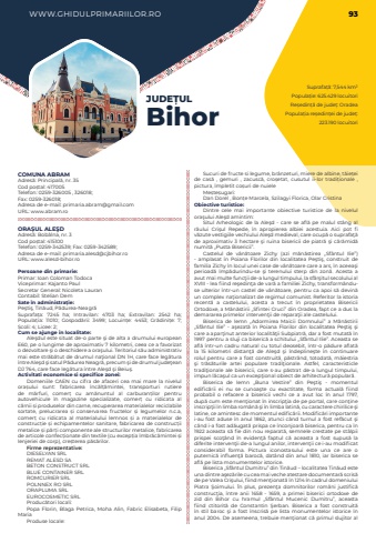 WWW.GHIDULPRIMARIILOR.RO 93Suprafa%u021b%u0103: 7,544 km%u00b2Popula%u021bie: 625.429 locuitoriRe%u0219edin%u021b%u0103 de jude%u021b: OradeaPopula%u021bia re%u0219edin%u021bei de jude%u021b: 223.190 locuitoriJUDE%u021aULBihorCOMUNA ABRAMAdres%u0103: Principal%u0103, nr. 35Cod po%u0219tal: 417005Telefon: 0259-326005 , 326018; Fax: 0259-326018; Adresa de e-mail: primaria.abram@gmail.comURL: www.abram.roORA%u0218UL ALE%u015eDAdres%u0103: Bob%u00e2lna, nr. 3Cod po%u0219tal: 415100Telefon: 0259-342539; Fax: 0259-342589; Adresa de e-mail: primaria.alesd@cjbihor.roURL: www.alesd-bihor.roPersoane din primarie:Primar: Ioan Coloman TodocaViceprimar: Kajanto PaulSecretar General: Nicoleta LauranContabil: Stelian DemSate %u00een administra%u021bie:Pe%u015fti%u015f, Tin%u0103ud, P%u0103durea-Neagr%u0103Suprafa%u021ba:%u00a0 7245 ha; Intravilan:%u00a0 4703 ha; Extravilan:%u00a0 2542 ha; Popula%u021bia:%u00a0 11010; Gospod%u0103rii:%u00a0 3499; Locuin%u021be:%u00a0 4453; Gr%u0103dini%u021be:%u00a0 7; %u0218coli:%u00a04; Licee:%u00a02; Cum se ajunge in localitate:Ale%u015fdul este situat de-o parte %u015fi de alta a drumului european E60, pe o lungime de aproximativ 7 kilometri, ceea ce a favorizat o dezvoltare %u015fi o deschidere a ora%u015fului. Teritoriul s%u0103u administrativ mai este str%u0103b%u0103tut de drumul na%u0163ional DN 1H, care face leg%u0103tura %u00eentre Ale%u015fd %u015fi satul P%u0103durea Neagr%u0103, precum %u015fi de drumul jude%u0163ean DJ 764, care face leg%u0103tura %u00eentre Ale%u015fd %u015fi Beiu%u015f.Activitati economice si specifice zonei:Domeniile CAEN cu cifra de afaceri cea mai mare la nivelul ora%u0219ului sunt: fabricarea %u00eenc%u0103l%u021b%u0103mintei, transporturi rutiere de m%u0103rfuri, comer%u021b cu am%u0103nuntul al carburan%u021bilor pentru autovehicule %u00een magazine specializate, comer%u021b cu ridicata al c%u0103rnii %u0219i produselor din carne, recuperarea materialelor reciclabile sortate, prelucrarea %u0219i conservarea fructelor %u0219i legumelor n.c.a, comer%u021b cu ridicata al materialului lemnos %u0219i a materialelor de construc%u021bie %u0219i echipamentelor sanitare, fabricarea de construc%u021bii metalice %u0219i p%u0103r%u021bi componente ale structurilor metalice, fabricarea de articole confec%u021bionate din textile (cu excep%u021bia %u00eembr%u0103c%u0103mintei %u0219i lenjeriei de corp), cre%u0219terea p%u0103s%u0103rilor.Firme reprezentative:DIESELYAN SRLREMAT ALESD SABETON CONSTRUCT SRLBLUE CONTAINER SRLROMCURIER SRLPOLNNEX RO SRLORAPLUMA SRLEUROCOSMETIC SRLProduc%u0103tori locali:Popa Florin, Blaga Petrica, Moha Alin, Fabric Elisabeta, Filip MariaProduse locale:Sucuri de fructe si legume, br%u00e2nzeturi, miere de albine, t%u0103ie%u021bei de cas%u0103%u00a0 , gemuri , zacusc%u0103, cro%u0219etat, cusutul ii-lor tradi%u021bionale , pictura, %u00eempletit co%u0219uri de nuieleMe%u0219te%u0219ugari: Dan Dorel , Bon%u021be Marcela, Szilagyi Florica, Olar CristinaObiective turistice:Dintre cele mai importante obiective turistice de la nivelul ora%u015fului Ale%u015fd amintim:Situl Arheologic de la Ale%u015fd - care se afl%u0103 pe malul st%u00e2ng al r%u00e2ului Cri%u015ful Repede, %u00een apropierea albiei acestuia. Aici pot fi v%u0103zute vestigiile vechiului Ale%u015fd medieval, care ocup%u0103 o suprafa%u0163%u0103 de aproximativ 3 hectare %u015fi ruina bisericii de piatr%u0103 %u015fi c%u0103r%u0103mid%u0103 numit%u0103 %u201ePusta Bisericii%u201d.Castelul de v%u00e2n%u0103toare Zichy (azi m%u0103n%u0103stirea %u201eSf%u00e2ntul Ilie%u201d) - amplasat %u00een Poiana Florilor din localitatea Pe%u015fti%u015f, construit de familia Zichy %u00een locul unei case de v%u00e2n%u0103toare care a ars, %u00een aceea%u015fi perioad%u0103 %u00eemp%u0103durindu-se %u015fi terenului sterp din zon%u0103. Acesta a avut mai multe func%u0163ii de-a lungul timpului, la sf%u00e2r%u015fitul secolului al XVIII - lea fiind re%u015fedin%u0163a de var%u0103 a familiei Zichy, transform%u00e2nduse ulterior %u00eentr-un castel de v%u00e2n%u0103toare, pentru ca apoi s%u0103 devin%u0103 un complex na%u0163ionalizat de regimul comunist. Referitor la istoria recent%u0103 a castelului, acesta a trecut %u00een proprietatea Bisericii Ortodoxe, a M%u0103n%u0103stirii %u201eSfintei Cruci%u201d din Oradea, fapt ce a dus la demararea primelor interven%u0163ii de repara%u0163ii ale castelului.Biserica de lemn %u201eAdormirea Maicii Domnului%u201d a M%u0103n%u0103stirii %u201eSf%u00e2ntul Ilie%u201d - a%u015fezat%u0103 %u00een Poiana Florilor din localitatea Pe%u015fti%u015f %u015fi care a apar%u0163inut anterior localit%u0103%u0163ii Subpiatr%u0103, dar a fost mutat%u0103 %u00een 1997 pentru a sluji ca biseric%u0103 a schitului %u201eSf%u00e2ntul Ilie%u201d. Aceasta se afl%u0103 %u00eentr-un cadru natural cu totul deosebit, %u00eentr-o p%u0103dure aflat%u0103 la 15 kilometri distan%u0163%u0103 de Ale%u015fd %u015fi %u00eendepline%u015fte %u00een continuare rolul pentru care a fost construit%u0103, p%u0103str%u00e2nd, totodat%u0103, m%u0103iestria %u015fi tr%u0103s%u0103turile artei populare tradi%u0163ionale. Astfel, caracteristicle tradi%u0163ionale ale bisericii, care s-au p%u0103strat de-a lungul timpului, impun l%u0103ca%u015ful ca un excep%u0163ional obiect de arhitectur%u0103 popular%u0103.Biserica de lemn %u201eBuna Vestire%u201d din Pe%u015fti%u015f - momentul edific%u0103rii ei nu se cunoa%u015fte cu exactitate, forma actual%u0103 fiind probabil o refacere a bisericii vechi ce a avut loc %u00een anul 1797, dup%u0103 cum este men%u0163ionat %u00een inscrip%u0163ia de pe portal, care con%u0163ine inscrip%u0163ii %u00een limba rom%u00e2n%u0103 %u015fi %u00een limba latin%u0103, cu caractere chirilice %u015fi latine, ce amintesc de momentul edific%u0103rii. Modific%u0103ri importante i-au fost aduse %u00een anul 1862, atunci c%u00e2nd turnul a fost ref%u0103cut %u015fi c%u00e2nd i-a fost ad%u0103ugat%u0103 prispa ce %u00eenconjoar%u0103 biserica, pentru ca %u0